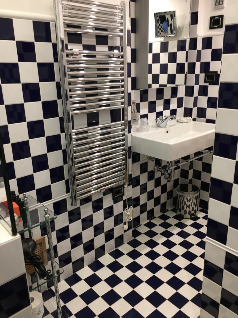 Han fulgte med os stolt op til værelset, som viste sig at være en stor totalt nyistandsat lækker lejlighed med en flot stue, køkken, stor entré, soveværelse og badeværelse i skaktern. I køleskabet stod der hvidvin og to flasker Pellegrino. Det er gratis og I må drikke lige så meget, I vil og få mere, sagde Mr Lucky. Stuens vinduer var mod Via del Babuino og soveværelsets mod den lille rolige kunstnergade Via Margutta. Perfekt beliggenhed max 200 meter fra den Spanske Trappe.