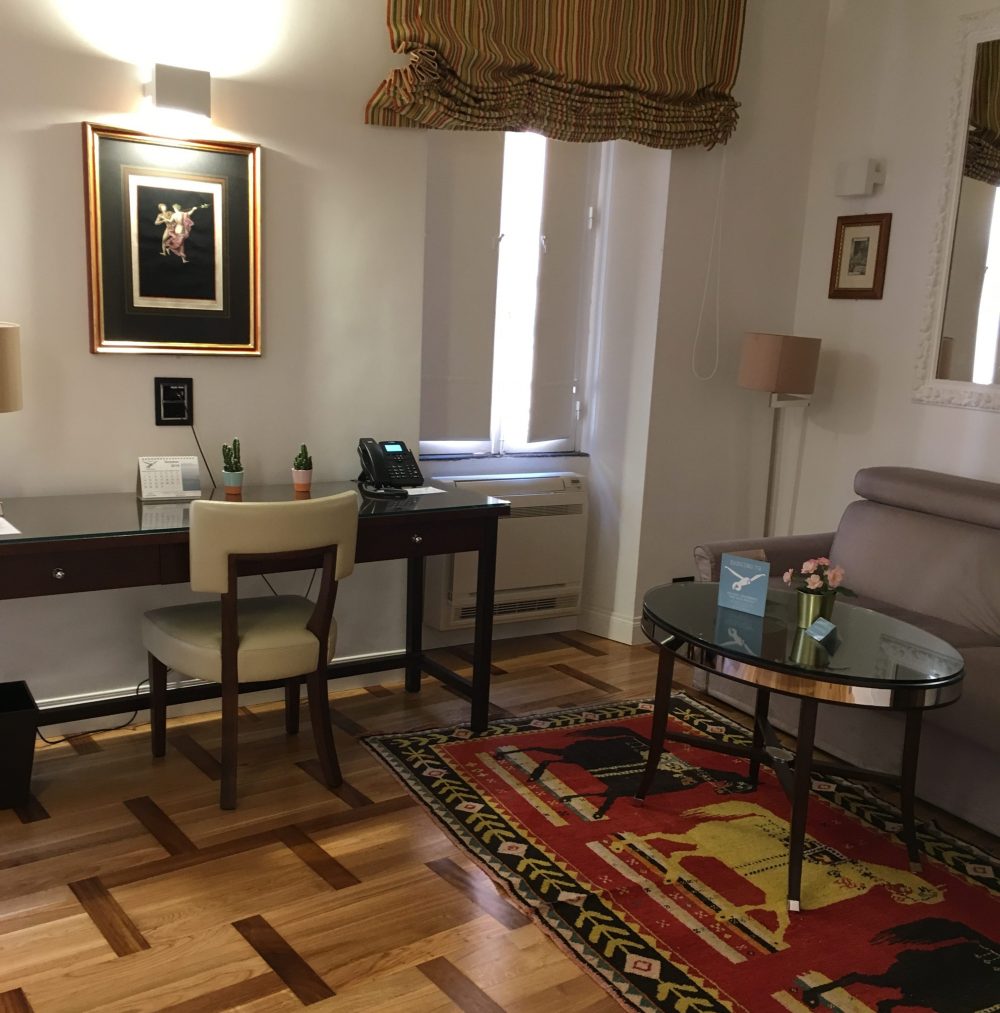 Han fulgte med os stolt op til værelset, som viste sig at være en stor totalt nyistandsat lækker lejlighed med en flot stue, køkken, stor entré, soveværelse og badeværelse i skaktern. I køleskabet stod der hvidvin og to flasker Pellegrino. Det er gratis og I må drikke lige så meget, I vil og få mere, sagde Mr Lucky. Stuens vinduer var mod Via del Babuino og soveværelsets mod den lille rolige kunstnergade Via Margutta. Perfekt beliggenhed max 200 meter fra den Spanske Trappe.