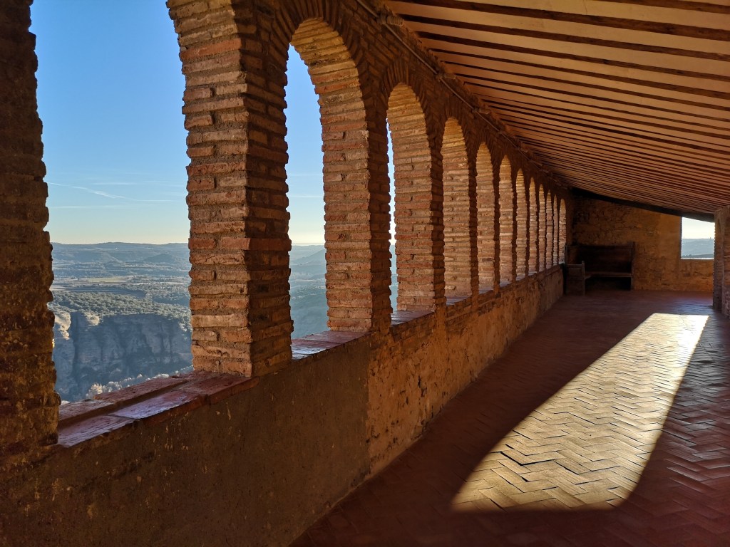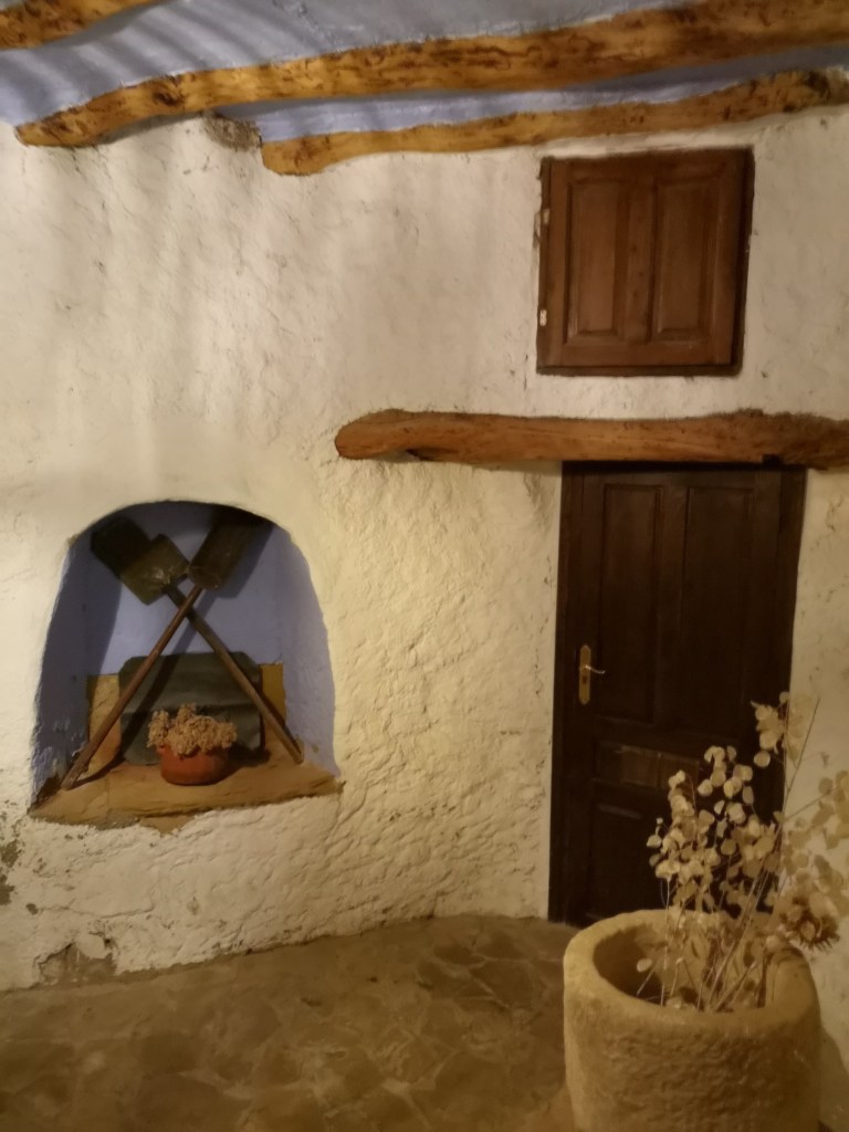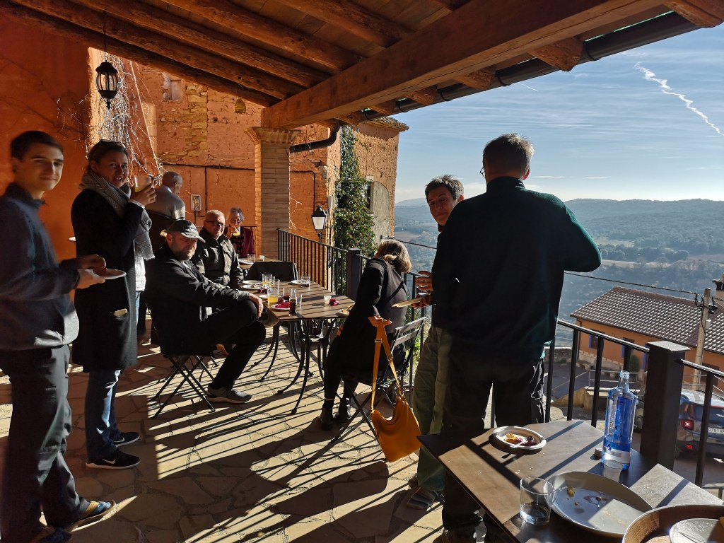 Vi fik et super hyggeligt værelse med balkon og udsigt over dalen. Hele hotellet er totalt lækkert istandsat i rustik stil med fritlagte bjælker, og man forelsker sig i alle små kroge og detaljer. Selvom det var januar, og der var rim på vinrankerne om morgenen, kunne vi nyde tapas og vin på terrassen i solens varme. Og om aftenen se tågen krybe op og dække dalen igen, så det lignede et hav.