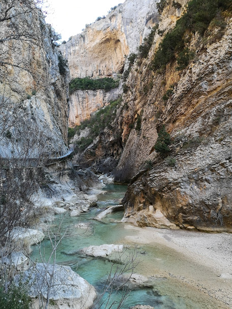 Alquézar er en af byerne på Unescos verdensarvliste, og det er fuldt fortjent. Normalt er byen proppet med turister, men ikke i januar, så vi kunne nyde skønheden i fred. Vi parkerede i udkanten af Alquézar, slentrede igennem byen efter skiltene mod Ruta de las Pasarelas og fandt en trappe ned bag kirken, hvor vores vandretur skulle starte. Vi tog den røde rute GR 1.1.