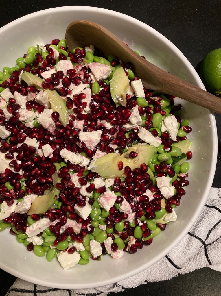 - Anret derefter agurk, avokado, edamamebønner, fetaost og granatæblekerner over
