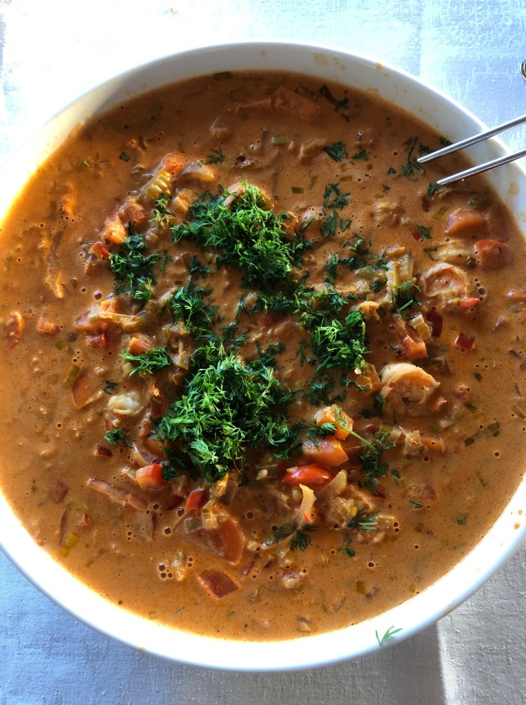 - Anret på et stort fad og læg rejerne rund i kanten og pynt med lidt frisk dild