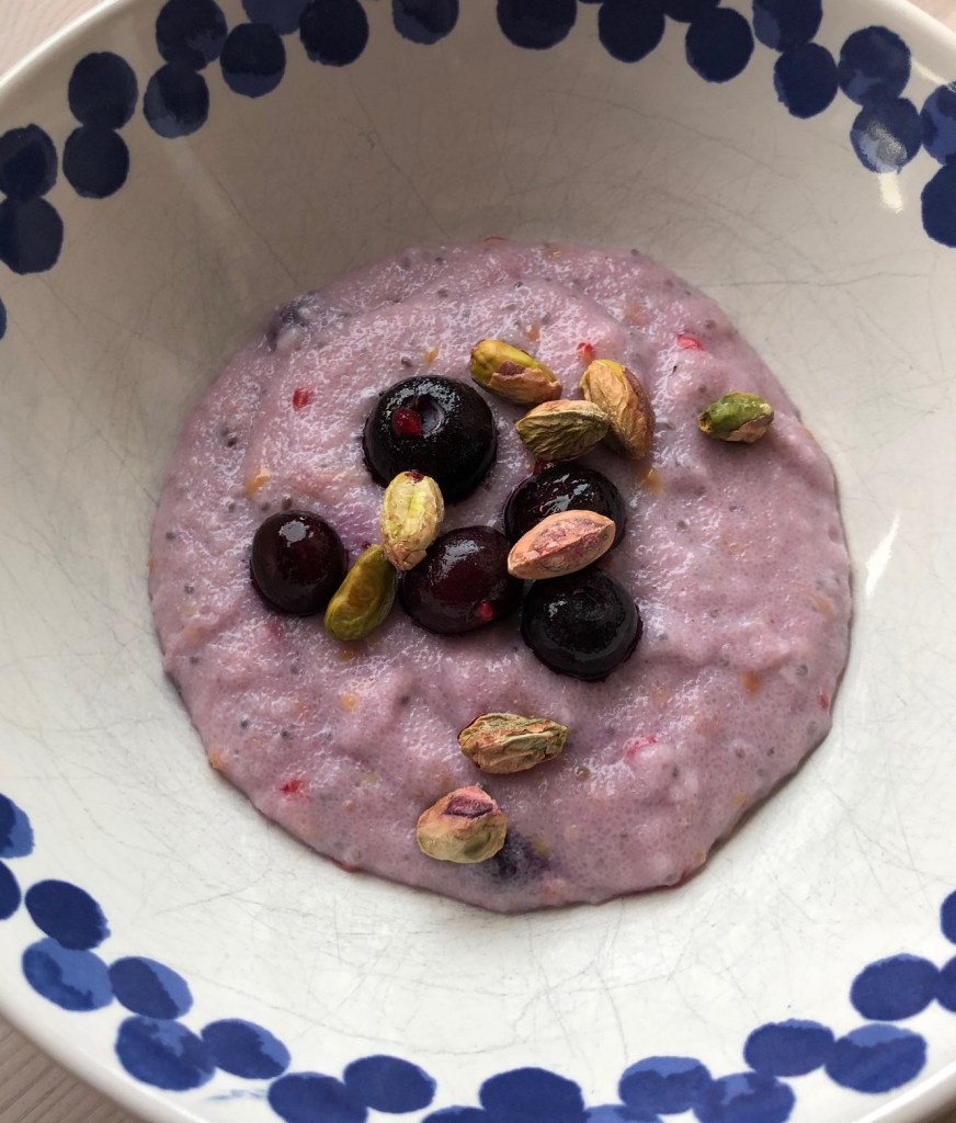 - Kog mælk, mannagryn, chiafrø og salt op i en gryde