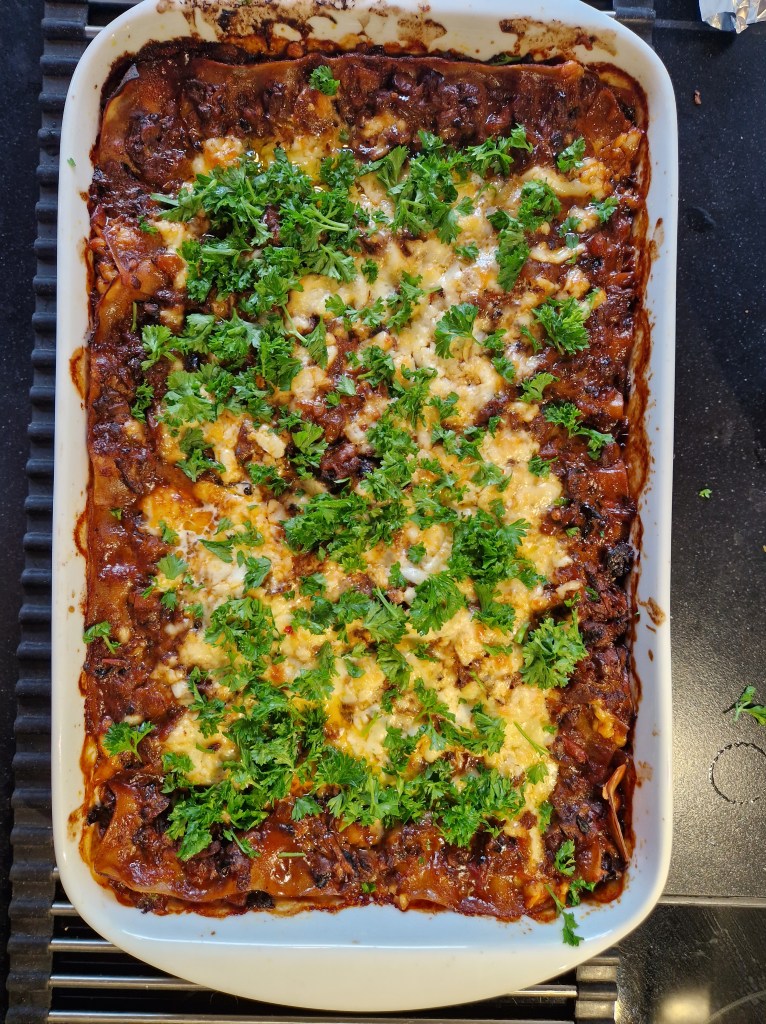 - Læg et lag lasagneplader over og gentag lagene tre gange i samme rækkefølge og rund af med et sidste lag sauce og ost (det vil sige 5 lag sauce og ost i alt, adskilt af 4 lag pasta)