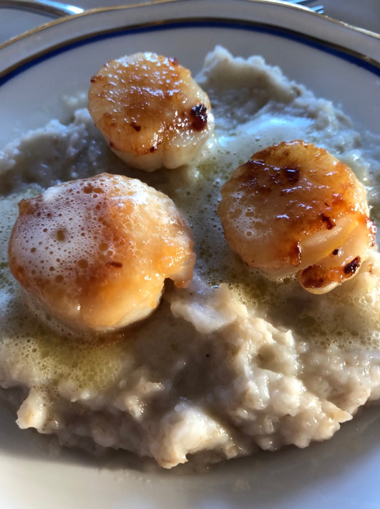 - Anret kammuslingerne på en bund af jordskokpuré og hæld limesaucen forsigtigt over