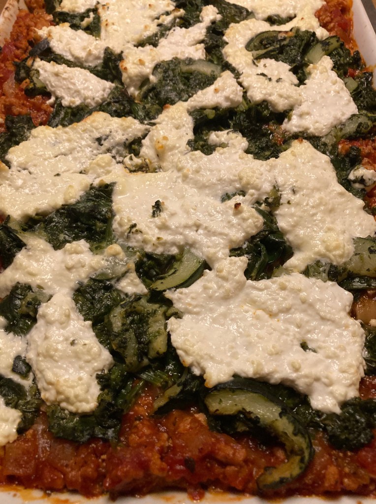 - Afslut med de sidste lasagneplader og herefter det sidste af kødblandingen og resten af spinaten, sørg for at lasagnepladerne er dækket