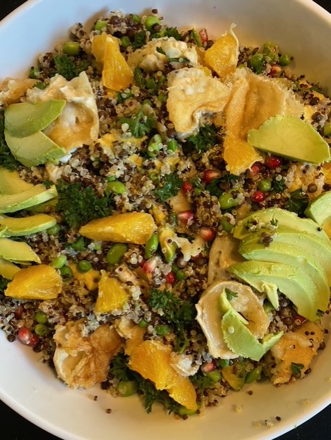 - Tilsæt bønner, ærter, kikærter, appelsin, avokado, granatæble, persille og grillet gedeost