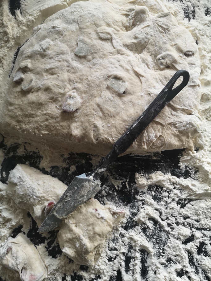 - Skrab dejen ud på et meldækket bord, fold den et par gange og skær bollerne ud med en dejskraber.